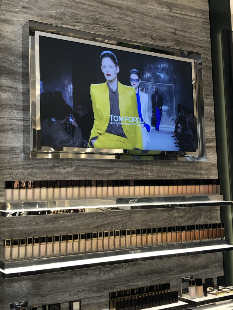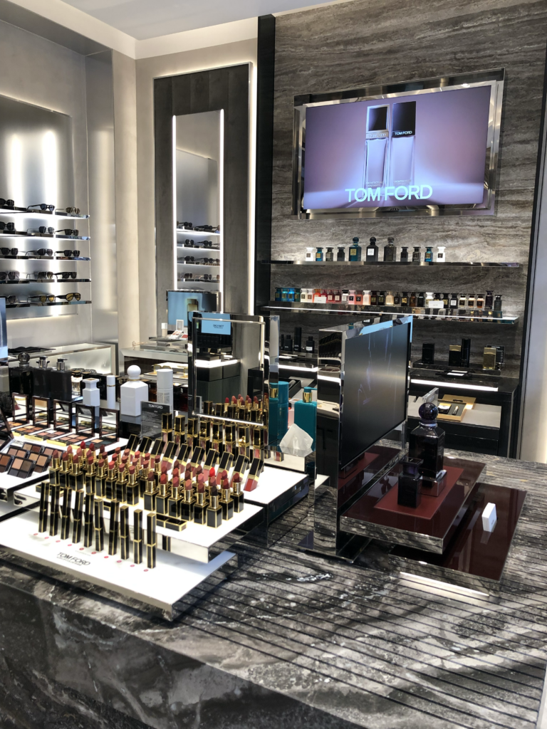Les produits de Tom Ford sont mis en avant dans des espaces dédiés, parfaitement identifiés. Rien n’est laissé au hasard : d’un côté, les parfums ; de l’autre, le maquillage. Même les lunettes Tom Ford trouvent leur place dans une mise en scène qui rappelle les lignes fortes de la marque.