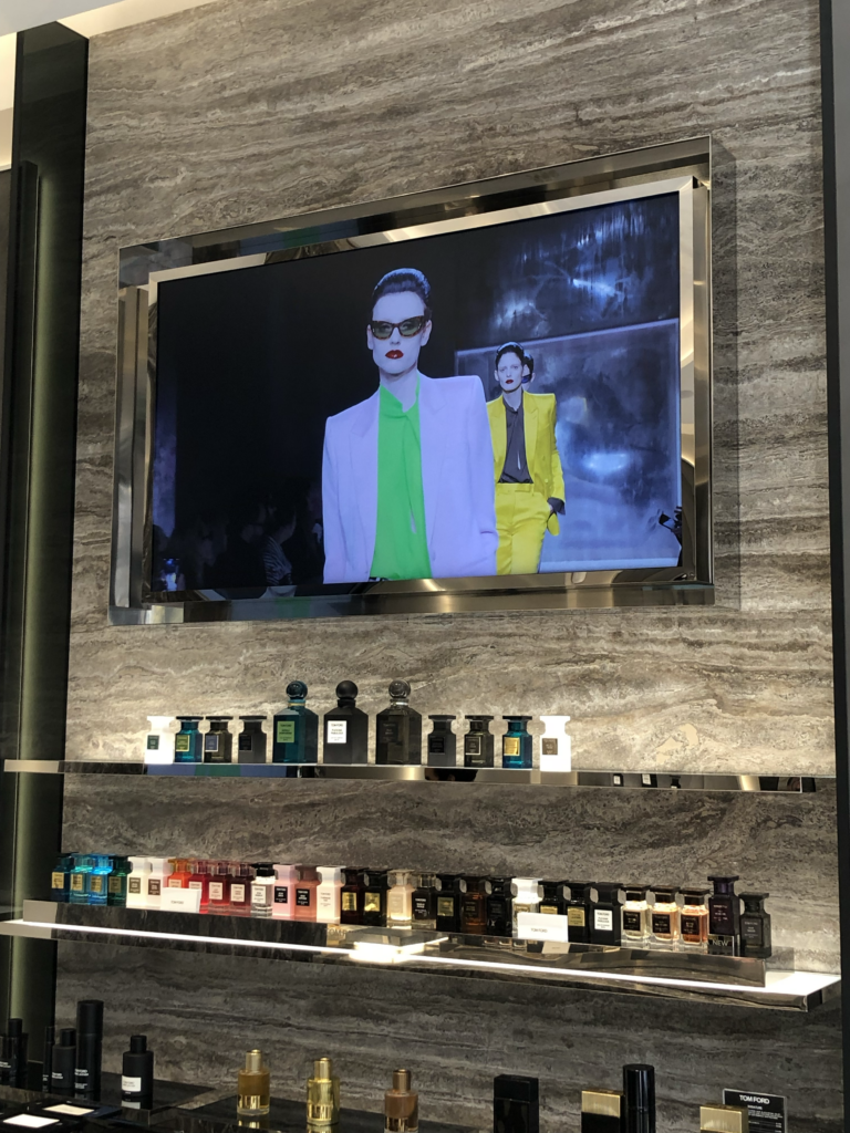 Dès l’entrée, le design de la boutique impose la vision singulière de Tom Ford : une esthétique architecturale, brut et minimaliste. Le marbre trône au centre de l’espace , clin d’œil assumé aux défilés de la marque. Ce matériau affirmé vient sublimer les flacons colorés des parfums, qui se détachent dans un design pensé comme un écrin.