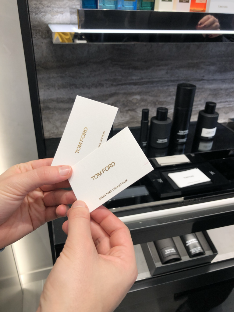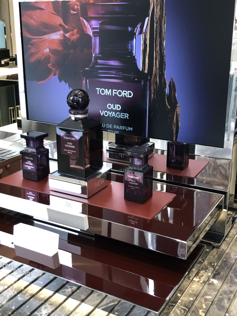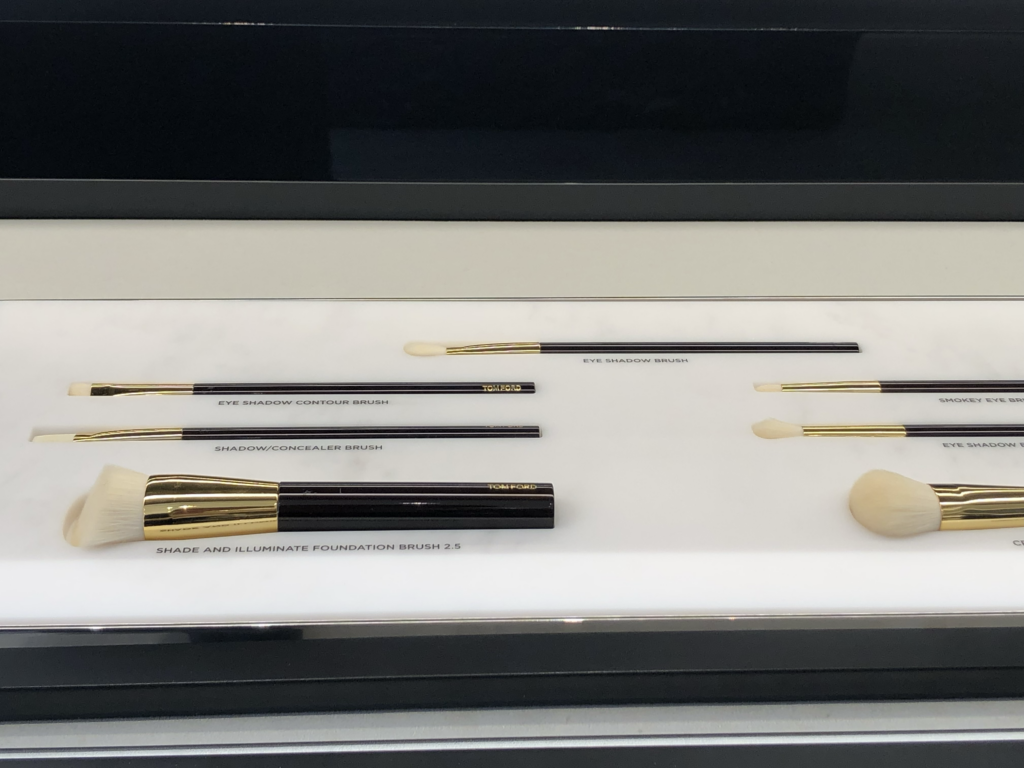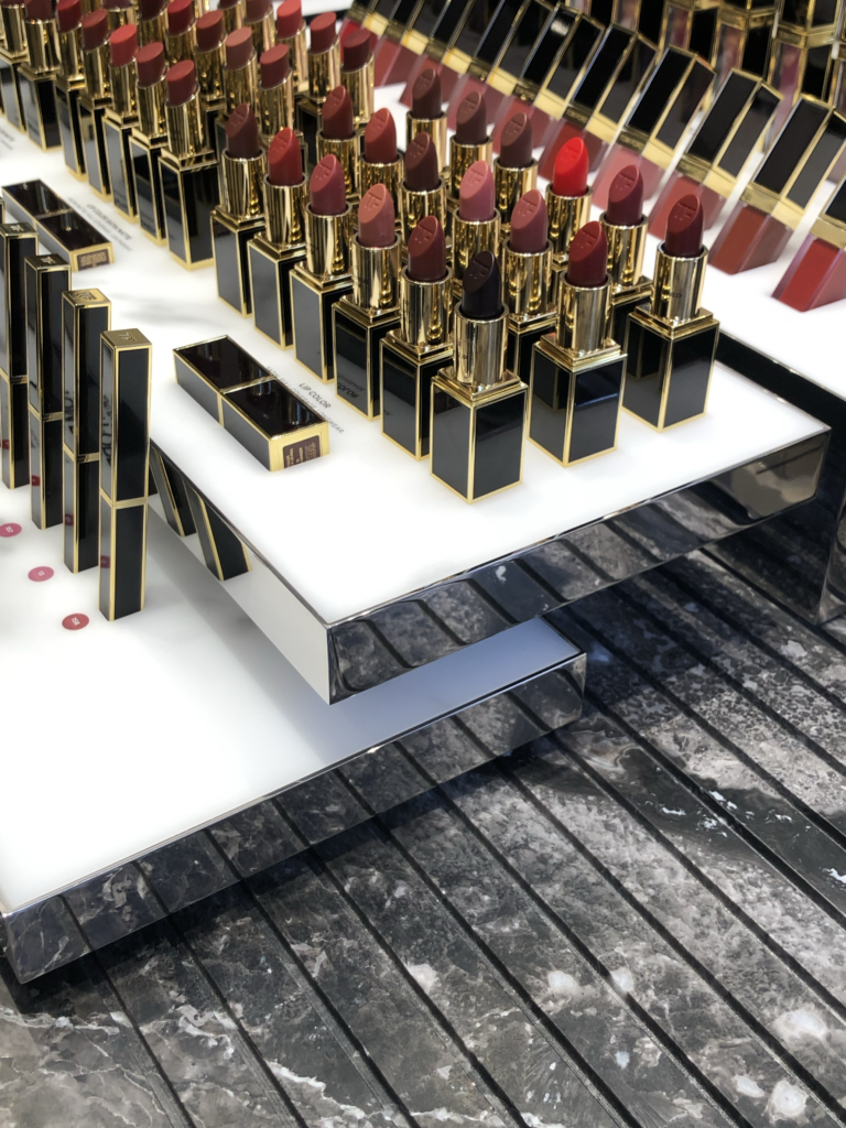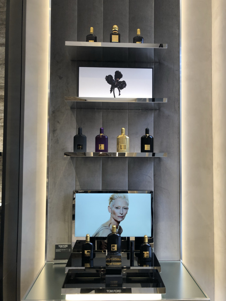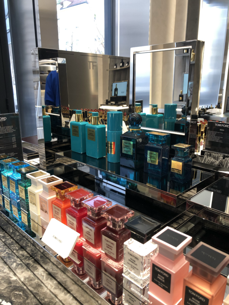 Les produits de Tom Ford sont mis en avant dans des espaces dédiés, parfaitement identifiés. Rien n’est laissé au hasard : d’un côté, les parfums ; de l’autre, le maquillage. Même les lunettes Tom Ford trouvent leur place dans une mise en scène qui rappelle les lignes fortes de la marque.