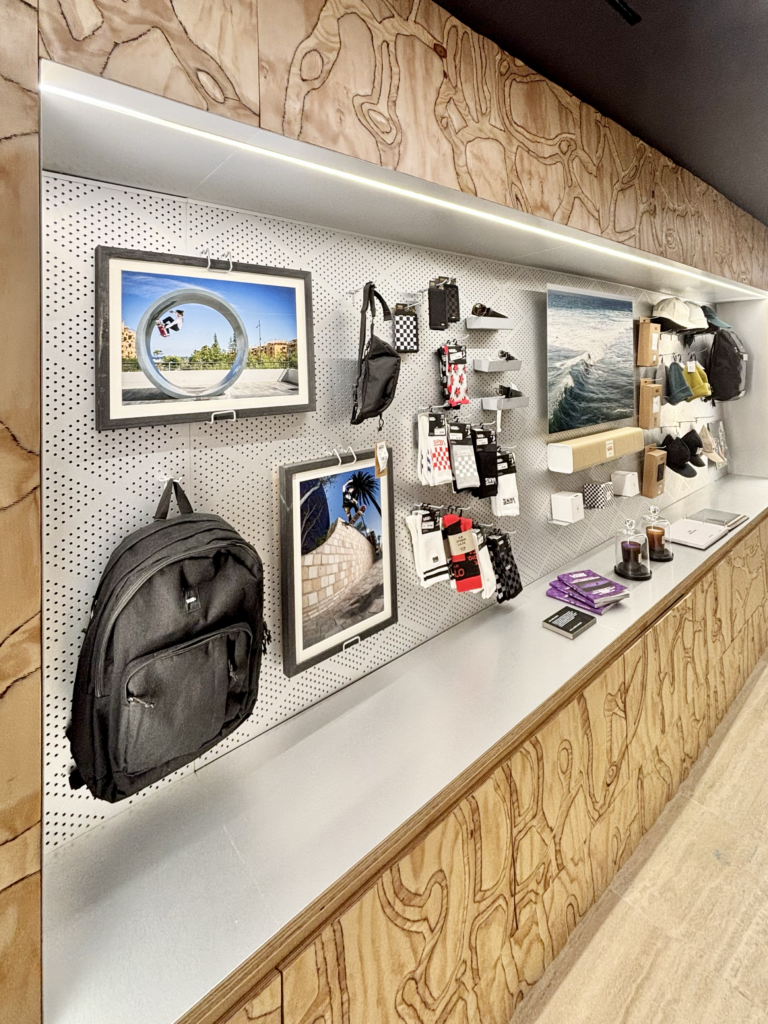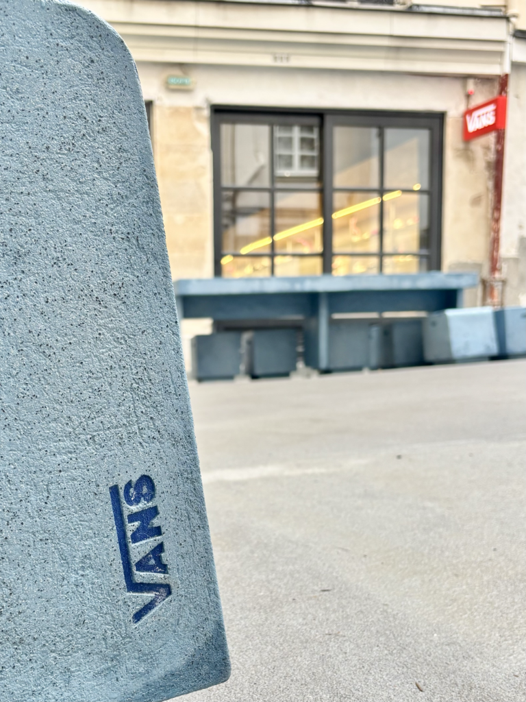 Le magasin s’étend sur près de 300 m², avec une grande cour capable d’accueillir des événements, des rencontres ou des performances. Le mobilier reprend les codes emblématiques de Vans, inspiré des skateparks, avec des matériaux bruts et des formes simples.